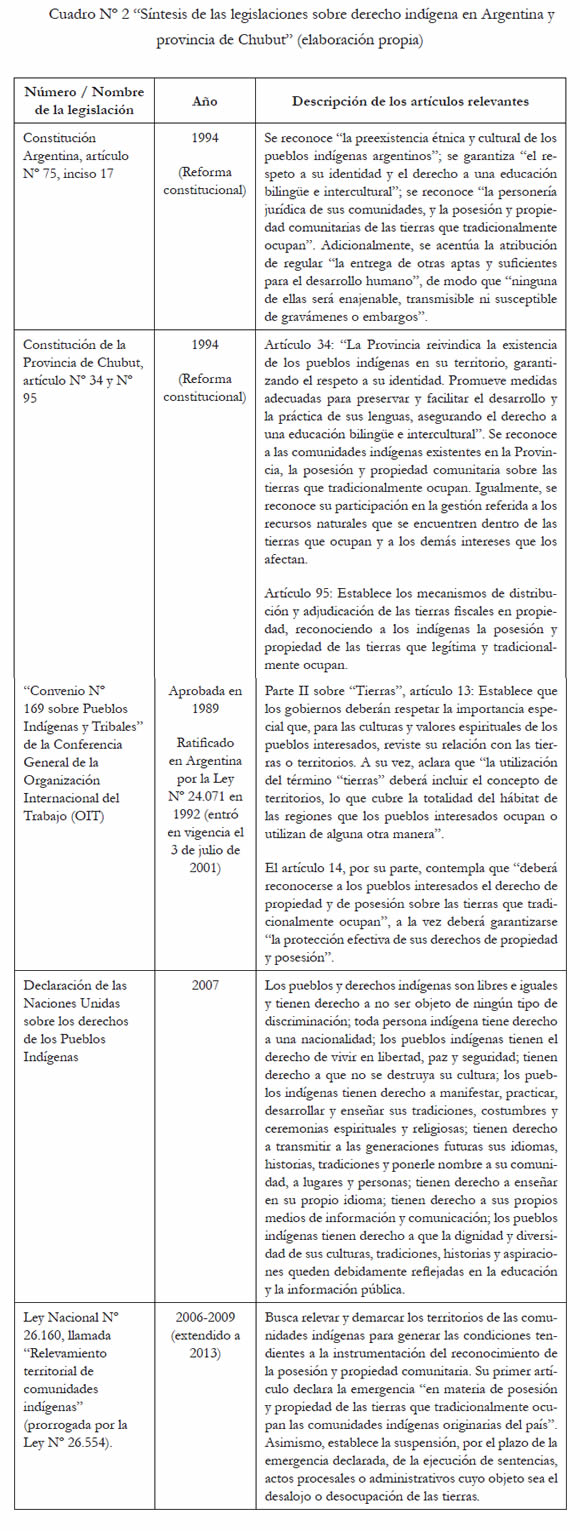 Se comenzó por indagar los saberes previos sobre los derechos en general y el derecho indígena en particular. Aquí, se reveló necesario enfatizar en las particularidades de los derechos de los pueblos originarios. Posteriormente, se trabajó sobre la organización legal con los alcances de cada legislación o convenio, según su carácter provincial, nacional o internacional. Se hizo especial énfasis en la reforma de la Constitución Nacional de 1994, que incorpora la preexistencia étnica y cultural; en la reforma del mismo año de la Constitución de la Provincia de Chubut; en el Convenio No. 169 de 1989 de la OIT sobre el reconocimiento de las tierras comunitarias; en la Declaración de la ONU del 2007 sobre los derechos de los pueblos indígenas; así como en la Ley nacional No. 26160 sobre el relevamiento de las comunidades indígenas en todo el país.