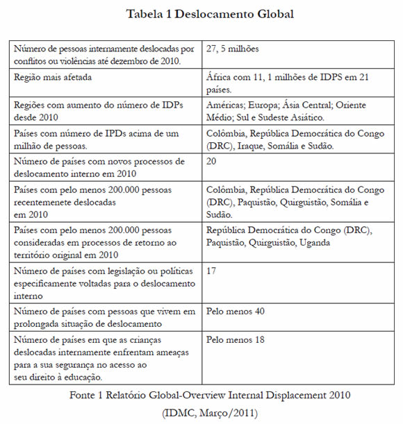 O monitoramento do IDCM, em escala mundial, permite avaliar a situação vivida atualmente por milhares de pessoas nos continentes americano, africano, asiático e europeu. Definidas como IDP –Internally Displaced Persons– protagonizam um deslocamento territorial coercitivo ou involuntário dentro das fronteiras nacionais. Em termos de países, os casos mais recentes são Libia e Afeganistão. No primeiro caso, entre os efeitos das rebeliões populares no norte da Àfrica em prol de reformas democráticas, ocorre desde fevereiro de 2011 o deslocamento forçado de mais de 106.000 pessoas provenientes, em sua maioria, das regiões de Benghazy, Ajdabiya e Tubruq. Já o Afeganistão possui aproximadamente 1,2% de sua população (352.000 pessoas) vivendo em situação de deslocamento forçado desde 2001. As causas vão dos conflitos armados e a violência generalizada às violações de direitos humanos. Na tabela abaixo é possível constatar em números o impacto global dessa realidade: