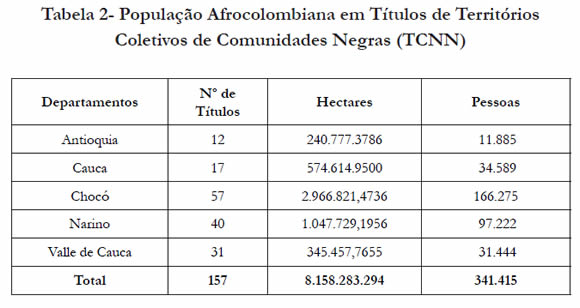 A titulação dos territórios coletivos das comunidades negras é a resposta mais urgente para a garantia da reprodução física e cultural das populações uma vez que o desplazamiento esta intimamente ligado ao quadro situacional de violência, exploração e concentração da terra. Isso é que ocorre na região do pacífico colombiano, área de maior concentração de comunidades negras e de ocorrência de titulação desde a Lei 70/1993, além de ter sido declarada como ecossistema de interesse nacional. No entanto, essa é uma região que registra altos índices de expulsão de populações afrocolombianas. O paradoxo entre a titulação e o desplazamiento pode ser mais bem observado nas tabelas comparativas entre os dois fenômenos:
