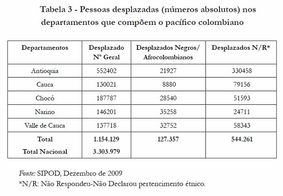 Nota–se que a Colômbia figura em dois momentos: como país com mais de um milhão de desplazados e com ocorrência de deslocamentos recentes. A combinação desses fatores aponta para o desplazamiento colombiano com expressiva representação no cenário mundial. Isso implica, obviamente, em atentarmos para as circunstâncias que circunscrevem esse quadro situacional, mas especialmente para as consequências e para quem as sofre de forma mais intensa. Por esse motivo, vamos explorar a conjuntura do caso colombiano direcionando nossa análise para a dinâmica das relações entre Estado e sociedade, privilegiando um olhar para as desigualdades etnicorraciais, as políticas públicas de combate a tais desigualdades e o contexto político vivido pela população afrocolombiana, a qual é o maior grupo social em situação de desplazamiento.