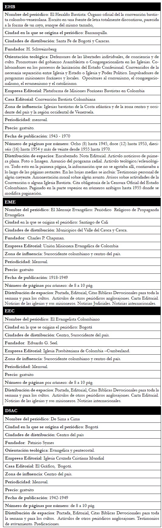 Durante la segunda mitad del siglo XX, la prensa desarrolló un papel determinante en la comprensión y extensión del ideario evangélico. Desde el primer momento en el que se comenzaron a escribir sus ideas y doctrinas, emergió una nueva etapa para el protestantismo. Cada denominación dejó impreso en papel periódico muchas de sus intenciones, asociadas a la moralidad, a las doctrinas, a los perfiles eclesiásticos y a los proyectos misionológicos, entre otros. Los evangélicos publicaron, de modo regular, breves periódicos en los cuales lo noticioso tenía que ver con la opinión, la disidencia religiosa y la posición teológica. En este estado de cosas, la atomización también se vio reflejada en la aparición de esta clase de proyectos editoriales, que sirvieron para activar distintas voces del protestantismo. Tal es el caso deEl Heraldo Bautista – EHB (1943-1976), de la Denominación Bautista Colombiana; de El Evangelista Colombiano – EEC (1918-1949), de la Iglesia Presbiteriana; de El Mensajero Evangélico – EME (1912-1959), de la Unión Misionera Evangélica Colombiana, y De Sima a Cima - DSAC (1941-1958), de la iglesia Cruzada Cristiana Mundial. Con muchas semejanzas, aunque también con notables diferencias en su acento, este conjunto al que se denomina la prensa evangélica colombiana difundió y defendió las ideas evangélicas y su agenda moral en busca de la libertad religiosa22.