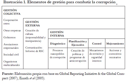 En la gestión colectiva, dichas organizaciones deben fortalecer el trabajo conjunto con otras entidades u organismos que permita unir esfuerzos en contra de la corrupción. No es suficiente el esfuerzo de una sola organización en la lucha contra la corrupción sino que se requiere de la sinergia de todos los actores sociales para que sea eficiente el proceso de prevención y erradicación de la corrupción. La responsabilidad social empresarial y las prácticas de anticorrupción deben ser un tema transversal para todas las áreas y operaciones de la organización, donde se tenga un sistema claro de planificación, ejecución, verificación y mejoramiento en el que se involucren todos los grupos de interés.