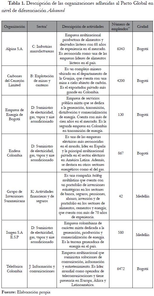 A la fecha del 17 de junio de 2013, en la página del Pacto Global se encontraban 363 organizaciones adheridas en Colombia, de las cuales 7 organizaciones contaban con los criterios anteriormente mencionados. En la tabla 1 **,*** se describen las compañías seleccionadas como población objeto de estudio.