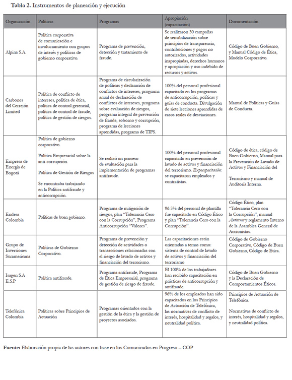 Respecto a los programas de anticorrupción, las organizaciones cuentan con programas encaminados al antifraude, a la ética empresarial y a la gestión de riesgos. Frente a la apropiación del tema, los planes de capacitación a los empleados están orientados desde temas generales como anticorrupción y antifraude, prevención de lavado de activos y financiación del terrorismo, hasta específicos como hospitalidad y regalos, neutralidad política y conflicto de intereses. Finalmente, la documentación está enmarcada por el código de buen gobierno y el código de ética. En la tabla 2 se presenta con más detalle los instrumentos de gestión implementadas por las siete organizaciones en la fase de planificación y ejecución.