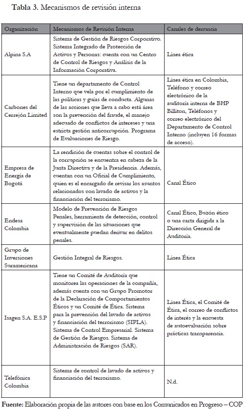 Mecanismos de revisión internos: Las organizaciones objeto de estudio cuentan con Sistema de Gestión de Riesgos Corporativos y con un organismo interno de control que monitorea las operaciones de la empresa y vela por el cumplimiento de políticas y códigos de buen gobierno y ética. Además, cuentan con canales de denuncia disponibles tanto a los clientes internos como externos, ya sea por la línea de ética o correo electrónico. En la tabla 3 , se muestran los mecanismos de revisión y seguridad internos que les permiten a las organizaciones controlar los procesos críticos y susceptibles de corrupción.