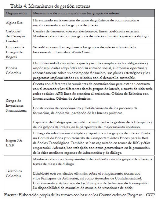 Las organizaciones se comunican e involucran con los grupos de interés a través de sistemas de comunicación, herramientas informáticas, mesas de diálogo, entre otros. A su vez, realizan capacitaciones en temas de responsabilidad social empresarial y ética empresarial con sus aliados estratégicos. También informan oportunamente sus planes y programas a través de los informes de RSE, de sostenibilidad o a través de la página web. En la tabla 4, se muestran los mecanismos de comunicación con los grupos de interés.