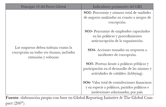 Una vez identificadas las organizaciones, se procede a la búsqueda de sus COPs, los cuales son socializados en la página web del Pacto Global para el período en mención. Para identificar las prácticas de anticorrupción desde los documentos mencionados, se realizó una matriz de análisis de acuerdo a los indicadores de desempeño del Global Reporting Initiative (GRI) G3 relacionados con el décimo principio del Pacto Global. Para adelantar esta tarea se utilizó el documento 'Estableciendo la conexión: Guía para la elaboración de memorias de sostenibilidad del GRI y Comunicación del Progreso del Pacto Mundial' del Global Reporting Initiative & the Global Compact (2007), en donde exponen los indicadores asociados al décimo principio. Estos indicadores pertenecen a la sección del GRI Sociedad, específicamente a SO2, SO3, SO4, SO5, SO6 (ver anexo1). Además, se tuvieron en cuenta los tres elementos que propone el Pacto Global (PG) para luchar contra la corrupción y en pro de la implementación del décimo principio: acción interna, acción externa y acción colectiva (Errath, et al., 2005)