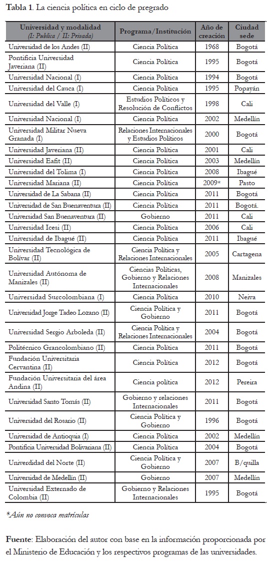 3 Algunos de estos elementos los he planteado en mi trabajo "Tres momentos del proceso de institucionalización de la ciencia política en Colombia 1968-2012", en imprenta.