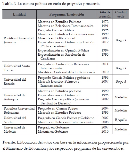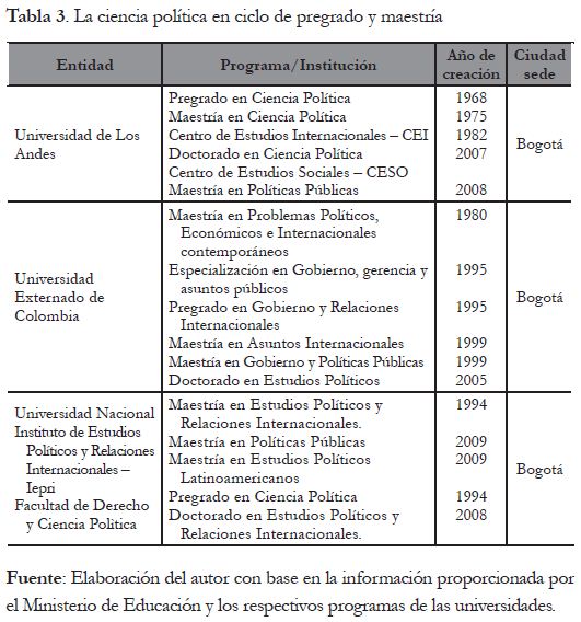 Tras la creación del Instituto de Estudios Políticos y Relaciones Internacionales (Iepri) de la Universidad Nacional (1986) y del Instituto de Estudios Políticos de la Universidad de Antioquia (1990), se dio un proceso gradual de creación de pregrados y maestrías en el país. A mediados de la década de 1990 ya había en el país cinco pregrados y siete maestrías; una década después aumentó a ocho y diez, respectivamente. Crecía el número de personas identificadas como politólogos de formación, especialmente vinculados a la docencia universitaria. En Cali funcionó también una extensión de la Maestría de Estudios Políticos de la Universidad Javeriana, que graduó a muchos profesores universitarios del suroccidente del país. La década siguiente fue de crecimiento y proliferación hasta llegar a 31 pregrados, 20 maestrías y tres doctorados. En las Universidades de los Andes, Nacional y Externado se completó el ciclo de formación (ver Tablas 2 y 3).