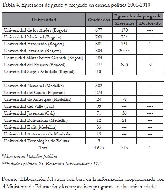 En el año 2000 se graduaron los primeros politólogos de universidad pública, en la Universidad Nacional de Bogotá (Villamil, 2001); también desde el 2001 en Popayán, Cali, Medellín y otras ciudades. Entre 2001 y 2010 se han graduado cerca de cinco mil politólogos en el país y más de setecientos en maestría en ciencia política y denominaciones afines como Estudios Políticos y Gobierno. Con la proliferación de programas se pasó de un pequeño núcleo conformado por los egresados de universidades de Bogotá y los que regresaban con títulos del exterior, a una comunidad disciplinar numerosa. Ello ha repercutido en la organización de grupos de investigación, en las publicaciones y en la ampliación del campo profesional.