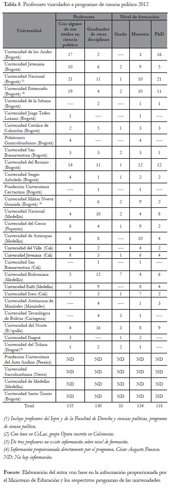 No obstante, en 16 universidades imperan profesores de otras disciplinas (57%), los nuevos programas suelen iniciarse con base en muy pocos profesores y generalmente de otras disciplinas; se forman politólogos en más de la mitad de programas del país con profesionales de otras disciplinas; se sigue asociando la ciencia política con las facultades de derecho, incluso en las dos universidades públicas más grandes del país (Nacional y Antioquia). Asimismo, en las dos universidades públicas en donde los programas fueron precedidos de la creación de institutos de estudios políticos, que han tenido un declarado sentido interdisciplinario, los porcentajes de profesores con título de politólogos son menores: Instituto de Estudios Políticos de la Universidad de Antioquia y el Instituto de Estudios Políticos y Relaciones Internacionales de la Universidad Nacional.