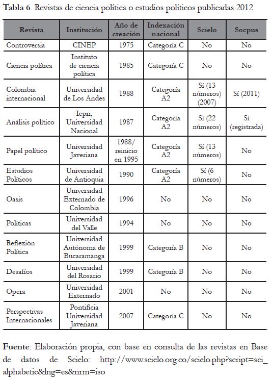 En el Iepri de la Universidad Nacional surgió la revista Análisis político en mayo de 1987. Fue presentada como la alternativa de socialización de conocimiento desde una universidad pública, frente al predominio de universidades privadas en la ciencia política. Se proponía asumir el rol de la Universidad como actor critico de la sociedad, "conciencia crítica", no sólo para producir y socializar conocimiento, sino también para generar debates y propuestas de transformación social. En la Universidad Javeriana empezó a publicarse, en 1988 y de forma discontinua, la revista Papel Político de la Facultad de Estudios Interdisciplinarios; cuando la facultad fue cerrada se suspendió también la publicación de la revista, que renacería en 1995 en la nueva Facultad de Ciencias Políticas y Relaciones Internacionales. A comienzos de la década de 1990, Estudios Políticos, del Instituto de Estudios Políticos de la Universidad de Antioquia fue la primera revista publicada fuera de Bogotá; al igual que la mayoría de publicaciones sostenía una orientación interdisciplinaria. La segunda revista fuera de Bogotá fue Políticas, del Instituto de Estudios Jurídicos, Políticos y Relaciones Internacionales de la Universidad del Valle, creada en 1994, circularon diez números hasta 1998, luego tuvo una segunda época entre 2005 y 2008. Desde 1996, con una periodicidad anual, la revista OASIS del Observatorio de Análisis de los Sistemas Internacionales, uno de los grupos de investigación del CIPE, de la Facultad de Finanzas, Gobierno y Relaciones Internacionales de la Universidad Externado, énfasis en las relaciones internacionales. En los años siguientes fueron creadas nuevas revistas: Desafíos, en 1996, revista del Centro de Estudios Políticos e Internacionales (CEPI) de la Facultad de Ciencias políticas y Gobierno y Relaciones Internacionales de la Universidad del Rosario; Reflexión Política, de la Universidad Autónoma de Bucaramanga, en 1999; Perspectivas Internacionales de la Universidad Javeriana, sede Cali, en 2007; la revista Ciencia Política de la Facultad de Derecho y ciencia políticas de la Universidad Nacional; y Opera, de la Universidad Externado. Sólo ha desaparecido la revista Políticas, del programa de Estudios Políticos y Resolución de conflictos de la Universidad del Valle, que en su nueva época llegó hasta el número ocho.