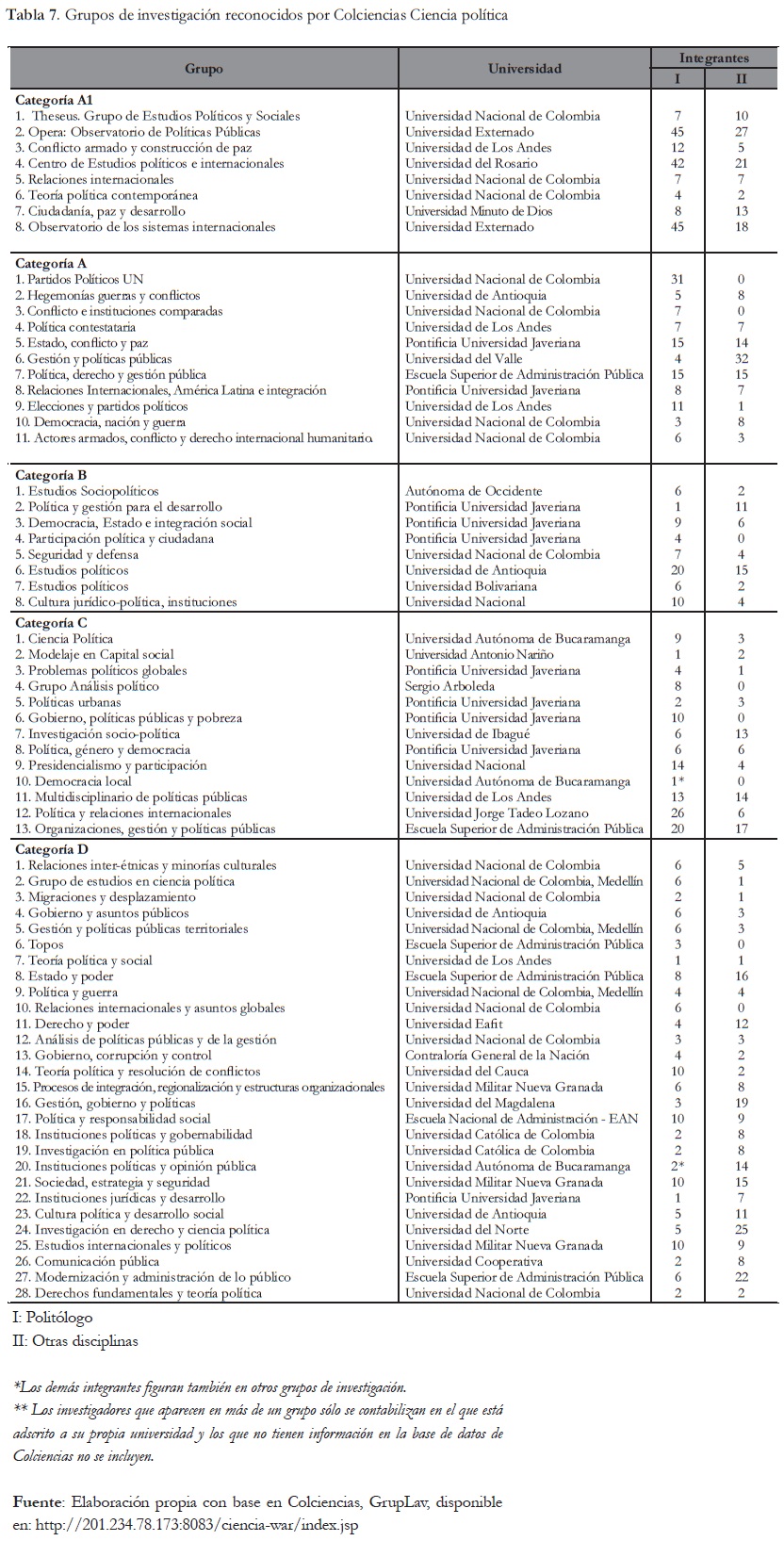 En sus inicios el tiempo dedicado a la investigación fue en la mayoría de los casos marginal y la docencia ocupaba la mayor parte de las labores académicas, existían pocos grupos de investigación y ellos jugaban un papel central algunos líderes académicos. En los registros de Colciencias se identifican siete grupos de investigación que se identifican como del campo de la ciencia política creados antes de 1990: uno en la Universidad de Los Andes conformado en su totalidad por politólogos; dos del Iepri de la Universidad Nacional conformados de forma interdisciplinaria y con presencia minoritaria de politólogos; dos en la Universidad Externado, en los cuales los politólogos también eran minoritarios respecto a profesionales de otras disciplinas y uno en el Instituto de Estudios políticos de la Universidad de Antioquia también interdisciplinario. Con el crecimiento de la comunidad académica el número de grupos se multiplicó y pasó de los nueve que había a finales de la década de 1990 a setenta y ocho en el 2012. Aunque es mayor el número de grupos que se autodefinen como del área de ciencia política, incluimos sólo aquellos que además tienen al menos un politólogo entre sus investigadores (ver tabla 7).