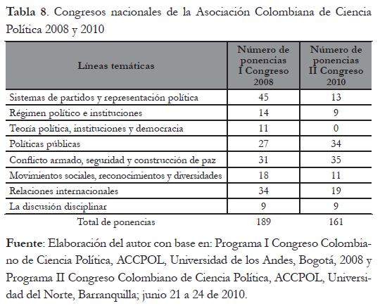 En el 2008 fue realizado el primer congreso con sede en la Universidad de los Andes en Bogotá y contó con más de mil asistentes, politólogos y de disciplinas afines. Se presentaron conferencias centrales y ponencias en ocho líneas temáticas que dan un panorama de los intereses temáticos y de los sub campos que se han perfilado. Hubo ochenta mesas y 189 ponencias. El segundo congreso se realizó en la Universidad del Norte en Barranquilla en el 2011, y se organizó con base en las mismas ocho líneas temáticas del primero, aunque se redujo de forma drástica los asistentes, cerca de 300 y fueron presentadas 161 ponencias (ver Tabla 8).