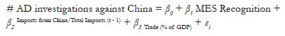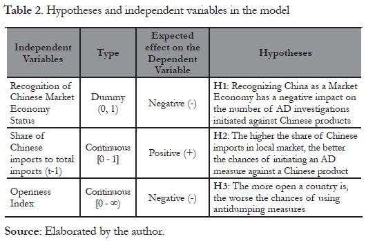The paper tests the hypothesis that the recognition of China as a Market Economy had a negative impact on the number of antidumping investigations initiated against Chinese products by countries that had recognized China before. To control the effect of the MES recognition on the use of antidumping investigations in the statistical model it tests two additional hypotheses. (H2) The higher the share of Chinese imports in local market, the better the chances of initiating an antidumping investigation against a Chinese product; and (H3) the more open to trade a country is, the worse the chances of using antidumping measures. Table 2 presents the three hypotheses tested, and the expected effect of the variable chosen to operationalize each hypotheses. The three independent variables to test the three hypotheses are: (a) Recognition of Chinese MES, (b) Share of Chinese imports to total imports, (c) Trade Openness.