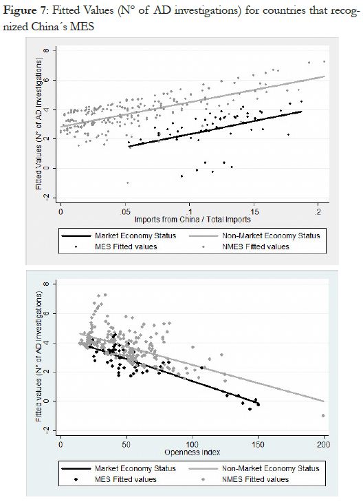 The graphical representation of the Fitted Values against each of the control variables show that countries that recognized China as MES reduced the number of antidumping investigations, as can be observed in Figure 7 showing the fitted values against each of the control variables.