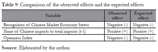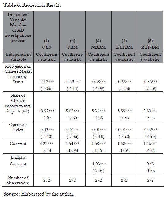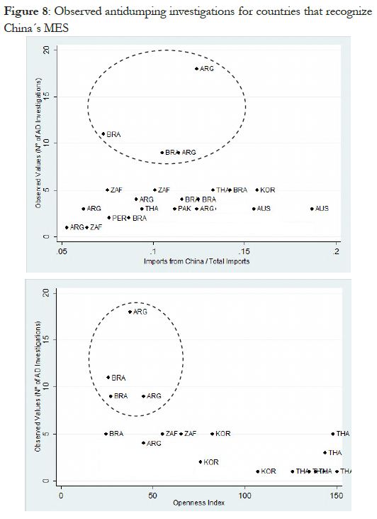 The observed values for the countries that have recognized China as a Market Economy show that they have remained below 5 annual investigations, with the exception of Argentina and Brazil during two years each. Such behavior is discussed in the next section.