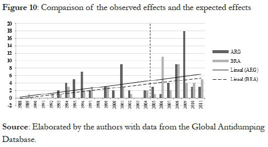 Argentina and Brazil, which are among the top ten antidumping users in the world, have, together, applied 88 investigations against Chinese products between 2001 and 2010. Their antidumping investigations did not decrease after signing the Memorandums of Understanding, as can be seen in Figure 10.