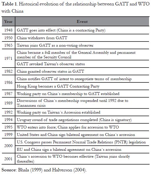 The 15 years of negotiations between China and the WTO have been studied in depth and there is a rich literature about it. It is also necessary to mention that the history of China's WTO has its background in the General Agreement on Tariffs and Trade (GATT), in which it was a founding member (Halveson 2004). Bhala (1999) and Halverson (2004) point out that it is necessary to go back to 1948 to truly understand this complex history during which profound changes happened in the bosom of China. There are three main historical reasons for this long term complex process and Table 1 summarizes the main historical facts discussed by the authors. First of all, and most importantly, the communist revolution and the Taiwan's split. Second, the different positions existing within domestic politics in China. As Douglas Newkirk -a former Assistant United States Trade Representative- commented, "[t]he GATT wasn't written with a socialist market economy in mind. The China's transition from a communist to a market economy, and the often-repeated, oxymoronic declaration by its elder leaders that it has a 'socialist market economy' complicated the entry process" (Bhala 1999, p.1480). The third reason that complicated the negotiations was whether China would gain admission as a developing or developed country. United States insisted that China join the WTO as a developed country which implicated heavier concessions from China. After fifteen years of negotiations, by the end of the millennium the proaccession forces in the Chinese government gained the domestic battle arguing that the advantages of membership would outweigh the disadvantages. The bilateral agreement with the US and the EU in 1999 and 2000, respectively, routed the long awaited entry of China into the WTO which was finalized in December 2001.