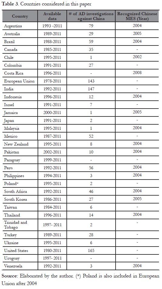 GAD has been freely and publicly available since 2005, hosts detailed data on more than thirty different national governments' use of policies such as antidumping, global safeguards, China-specific transitional safeguard measures, and countervailing duties. The authors considered the 31 countries available in the GAD Database, using all the antidumping measures initiated by China per year. As can be seen in Table 3, not every country in the database recognizes Chinese MES.
