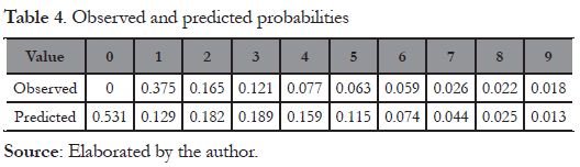 Most of the years recorded had one antidumping investigation against a Chinese product. The database omits years when there were no measures, so the database has no zeros. A useful place to begin is comparing predicted and observed values (Long, 1997). The listed values in Table 4 are the observed and predicted probabilities for observing a country with 0 through 9 antidumping investigations in a given year.