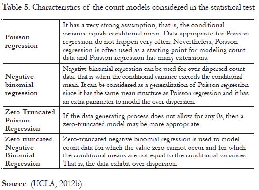 Table 6 is a summary of the regression results for all the possible models. As can be seen, all of them have similar coefficients (except for OLS which was included to show its bias), and high statistical significance. Zero-truncated Negative Binomial Regression (ZTNBM) is the count model which shows the higher coefficients, and the lower z values. Among the four count models, ZTNBM showed the best fit.