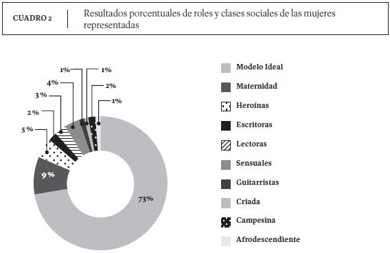 Las heroínas, escritoras y lectoras se encuentran retratadas en poca cantidad, lo cual demuestra una ausencia en la representación de las mujeres cuando ejercen roles diferentes del tradicional. Sin embargo, llama la atención cómo en algunas de estas representaciones lo que se promueve son las mismas características femeninas del modelo idealizado como es el caso de las heroínas. Como ocurre con las imágenes de Policarpa Salabarrieta en las cuales se promueve el rol de mártir que se asemeja a las características virginales del modelo hegemónico, esta heroína no se representa por sus acciones revolucionarias sino por su acción de morir por la patria.