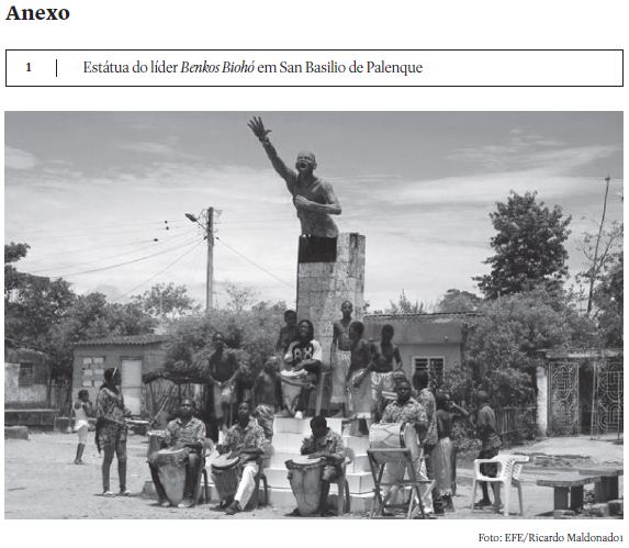 Então vemos como a figura de Benkos Biohó, junto com a formação dos palenques, representa esse diálogo entre a África e a América, envolvida nesse processo tão significativo na história da humanidade como foi a diáspora africana. Nesse sentido, torna–se central para entender a configuração de San Basilio de Palenque hoje, que, com aproximadamente 4000 habitantes, é uma das maiores mostras da África na Colômbia e na América. De fato, ao chegar a San Basilio há uma estátua do líder africano, que serve como elemento de identidade na comunidade. A figura de Benkos Biohó se encontra nas histórias dos mais velhos até os mais jovens e, de certa forma, simbolicamente contribui para a manutenção da memória cimarrona (Ver Anexo 1).