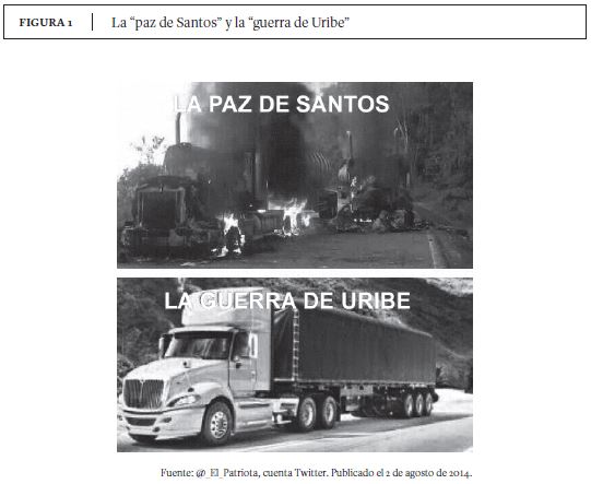 La pregunta ''¿Ésta es la paz de Santos?'' también se ha hecho tendencia en las redes sociales, apareciendo en los comentarios de todas las noticias que tienen que ver con las acciones subversivas (bajas de la Fuerza Pública, atentados terroristas, etc.). La difusión de un ''hashtag'' en internet, aunque parezca algo banal, no es un asunto de menor importancia. Esta frase es una unidad cultural: los que la replican comparten un significado concreto sobre la ''paz de Santos'', se ubican en una posición específica del espacio político (Martínez, 2014). Esta pregunta representa y explicita el reclamo de Uribe y sus seguidores con respecto a la actual negociación de paz. En esta pregunta, el discurso global del Centro Democrático expresa una inquietud y logra que todo un grupo de personas se aglomere alrededor de la misma. Cuando, sin necesidad de escuchar opiniones o directrices de los líderes del partido, sus militantes y seguidores operan bajo un mismo modelo de contexto (Van Dijk, 2001) y son capaces de interpretar eventos/ situaciones de forma parecida, se puede decir que se ha llegado a un conformismo lógico. Aquí, entonces, se observa el poder performativo del discurso en acción: en la formación de una comunidad de sentido, cuyos miembros son capaces de coordinar representaciones mentales y acciones sin necesidad de una comunicación permanente.