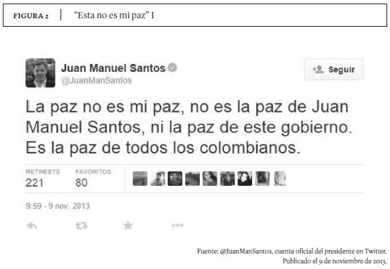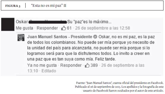 La fórmula ''paz de Santos'' ha tenido tal resonancia que desde el gobierno se han sentido en la obligación de reaccionar contra ella. En las cuentas oficiales de Juan Manuel Santos en Facebook y Twitter frecuentemente se hacen alusiones al respecto (ver Figuras 2 y 3). Quien escribe en estas cuentas seguramente no es el presidente Santos, sin embargo, es un community manager pagado por el gobierno que no puede decir cualquier cosa, sino que debe contextualizar los eventos/situaciones dentro del discurso global de dicho gobierno. La reacción discursiva del gobierno ha sido quitarle el apellido ''de Santos'' a la paz y presentarla como la paz ''de todos los colombianos'', como podemos ver en las Figuras 2 y 3.