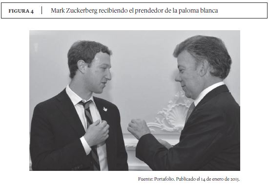 La ''lucha por ideas'' que sostienen el gobierno Santos y el Centro Democrático alrededor de las negociaciones de La Habana trasciende la dimensión de las palabras y abarca también imágenes. La paloma blanca, ligada en el imaginario colectivo al concepto de paz, ha sido adoptada como emblema del gobierno y el presidente la lleva siempre como prendedor en su solapa, y ha regalado este mismo prendedor a personajes de fama mundial como el futbolista Radamel Falcao o el empresario Mark Zuckerberg (ver Figura 4). Sin embargo, cuando el director de la Policía, general Jorge Nieto, fue visto en entrevistas y actos públicos portando el prendedor, la senadora uribista María del Rosario Guerra recordó que este es un ''logo de la campaña reeleccionista del santismo'', el símbolo de una postura política, algo a lo que no se deberían vincular los miembros de la Fuerza Pública (Caracol Radio, 2016). Así como la ''paz'' es la ''paz de Santos'', para la legisladora uribista la imagen que la representa también está irremediablemente ligada a la persona del presidente y a su proceso negociador.
