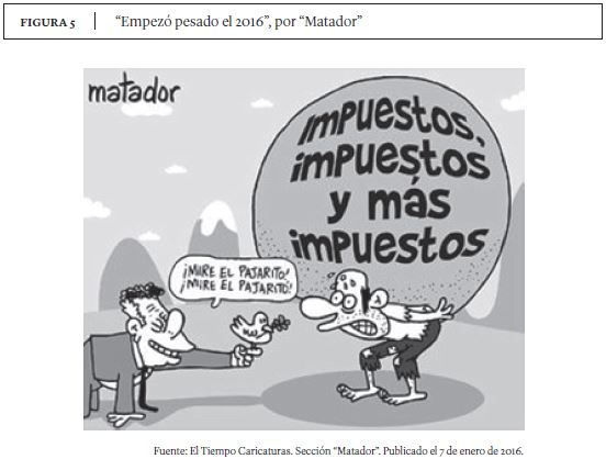 Operando bajo esta representación mental, en las páginas no oficiales de Facebook se comparten caricaturas de autores que no necesariamente son uribistas –y que de hecho critican y hacen burla de Uribe en otras ocasiones–, pero que comparten significados con esta comunidad de sentido. En una de estas caricaturas, obra de ''Matador'', la paloma blanca es representada no solo como un logo de Juan Manuel Santos, sino como una herramienta de distracción de la opinión pública, para que no resienta las alzas de impuestos (ver Figura 5). La caricatura, que puede encontrarse en el archivo virtual de El Tiempo, fue reproducida en enero de 2016 por la página ''Álvaro Uribe – El Gran Colombiano'', donde obtuvo 114 ''me gusta'' y la compartieron 128 usuarios, y la página ''Viva Uribe'', donde recibió 388 ''me gusta'' y fue compartida 331 veces. Este es un asunto de suma relevancia desde la teoría de la ''memética'', que observa los ''memes'' como unidades culturales que son replicadas dentro de internet porque los usuarios están de acuerdo con la información y el sentido que contienen (Martínez, 2014). En este caso, cientos de seguidores de Uribe consideran que el presidente Santos no solo se ha apropiado del concepto de ''paz'' y de la simbología que lo rodea, sino que recurre a estos elementos para ocultar problemas que tendrían los colombianos en otras áreas como la economía. A esta corriente de opinión se suman columnistas como Anastasia O'Grady, de The Wall Street Journal, quien acusa a Santos de estar buscando facultades para gobernar por decreto en nombre de la paz, y de haber planeado la dilatación de las negociaciones con las FARC con la intención de alargar su mandato (O'Grady, 2016).