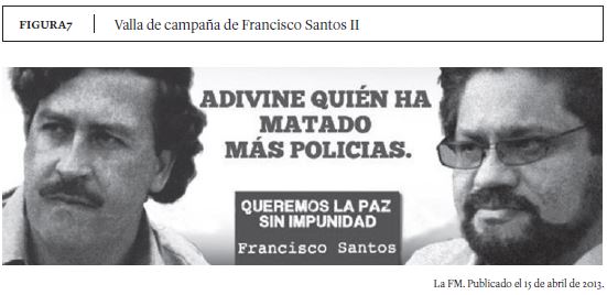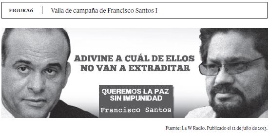 La estrategia discursiva del Uribismo ha ido cediendo desde el rechazo total a las negociaciones de paz hacia la exigencia de unos requisitos para que las negociaciones se lleven a cabo. Las sanciones penales a los insurgentes han quedado en el centro de la agenda, en el eje de la propuesta narrativa sobre el fin del conflicto, y sobre esto se despliega la estrategia discursiva de tipo populista punitiva. En las vallas de campaña de Francisco Santos, candidato a la Alcaldía de Bogotá, se compara a Iván Márquez (negociador de las FARC en La Habana) con otras figuras de la historia colombiana como el paramilitar Salvatore Mancuso y el narcotraficante Pablo Escobar, y se cuestiona que bajo el marco de la ''paz de Santos'' este personaje no recibiría el castigo que se merece o, en otras palabras, sus crímenes quedarían impunes (ver Figuras 6 y 7).