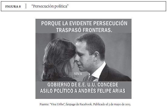 El discurso global del Centro Democrático parte de la premisa de que el poder judicial no está operando con independencia del ejecutivo y que la justicia está siendo utilizada como instrumento para atacar a Uribe y a su partido. El poder judicial, bajo esta lógica, ha sido cooptado por unos conspiradores que quieren cambiar los valores fundamentales de la nación (Gidron y Bonikowski, 2014). Los uribistas ven como héroes y víctimas de ''persecución política'' a militares (r) como Luis Alfonso Plazas y Rito Alejo del Río, a los exministros Andrés Felipe Arias y Sabas Pretétl, a la ex directora del DAS María del Pilar Hurtado y, por supuesto, al mismo Álvaro Uribe y sus familiares. Cuando estos personajes son llamados a juicio y salen del país para no asumirlo, no se dice que han escapado de la justicia, sino que se han refugiado de una persecución política (ver figura 6).