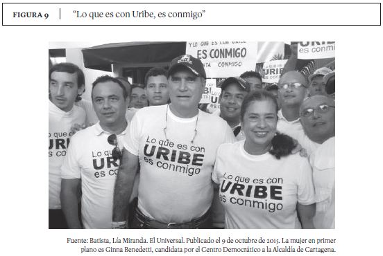 Los lemas de los partidos políticos son un elemento fundamental. ''Lo que es con Uribe, es conmigo'' es otra fórmula mágica y política, que cumple con la función de simbolizar y sintetizar la cosmovisión del colectivo y de ahí pasar a su proceso de amplificación (Benford y Snow, 2000). Este lema recoge el carácter personalista del partido (Gunther y Diamond, 2003 y Panebianco, 1990), es decir, reafirma el carisma personal del líder como componente indispensable de la organización, al llamar a profesionales de la política y profanos a cerrar filas a su alrededor. Así mismo, reafirma la desconfianza en el poder judicial y la idea de la ''persecución política''. El lema, además, es en gran medida agresivo, hostil. Indica que todo lo que se diga o haga en contra del líder será tomado por el seguidor como una afrenta personal. Es un lema con un poder performativo: llama a la organización y la movilización de un grupo, en contra del propio Estado si es que llega a ser necesario. Durante la campaña de 2015, los miembros y simpatizantes del Centro Democrático usaron este lema en banderas, camisetas, vallas publicitarias y en las fotos de perfil de sus redes sociales (ver Figura 7).