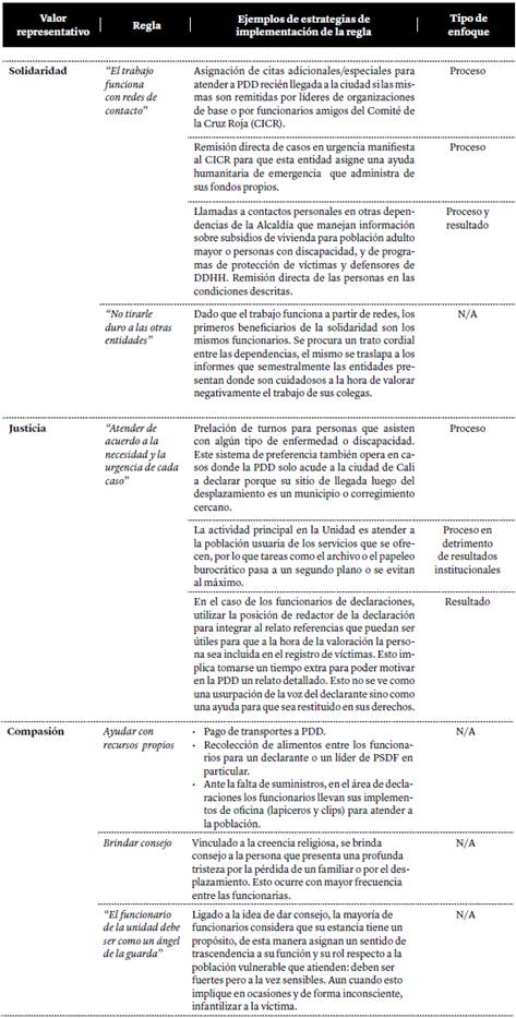 Con esto en mente, las estrategias de atención informales identificadas se relacionaban con los valores de la solidaridad y la justicia. Sin embargo, en el caso de la atención a las víctimas del conflicto prima la dignidad, la justicia transicional, la igualdad, la buena fe y el debido proceso, entre otros (Cap. II Ley 1448/11). En el caso de estudio, la igualdad, quedaba reducida al postulado "todos somos iguales ante la ley", pero en la práctica sí fue posible identificar un vestigio de trato diferencial afirmativo vinculado al ideal de justicia entendido como "dar a cada quien lo que se merece". Un hallazgo interesante es que de acuerdo con los entrevistados, las estrategias para una buena atención estaban ligadas a la compasión o empatía que el otro podía producir. El Cuadro 1 da cuenta de estos hallazgos.