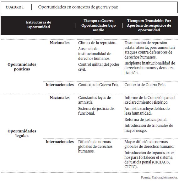 El análisis del proceso de apertura de las estructuras de oportunidad conforma una parte de la explicación acerca de por qué surgen ciertos tipos de iniciativas para saldar legados de violencia en tiempos de guerra y posguerra. De esta manera, importa destacar que la movilización social en defensa de los derechos humanos en que se insertan los esfuerzos para juzgar crímenes se vincula con las distintas características de los contextos de guerra y paz. Efectivamente, el contexto de la paz, entendido en su acepción básica como ausencia de conflicto bélico, posibilitó la progresiva construcción de la institucionalidad de garantías en derechos humanos y la introducción de programas de observación y monitoreo por parte de la comunidad internacional, mientras que en el plano nacional generó un clima propicio para tomar acciones en el ámbito judicial e impulsar juicios de derechos humanos.