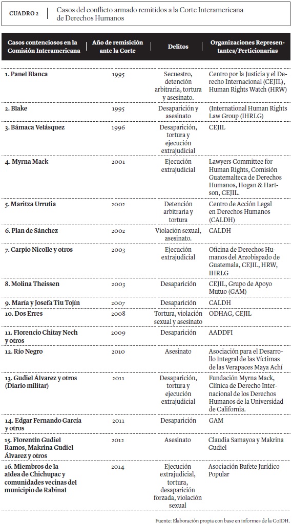 Hasta el año 2016 el número de casos del conflicto sometidos a la jurisdicción de la CoIDH suman 16 casos, que en general han concluido en condenas contra el Estado de Guatemala por denegación de justicia