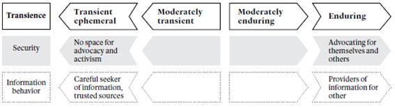 Aunque el esquema es útil, se puede asumir que estas etapas son una progresión lineal que refleja la experiencia impermanente y transitoria de los migrantes indocumentados. Como complemento a las etapas de asentamiento de Caidi y sus colegas, construimos el Continuo de la Transitoriedad (Vannini et al., 2016), en el cual las variables para entender los comportamientos de información de los migrantes latinos en EE.UU. son la transitoriedad y la permanencia. En un extremo se ubica la experiencia efímera y transitoria de la migración, asociada al comportamiento de información caracterizado por la cuidadosa búsqueda de información en fuentes altamente confiables, y en el otro extremo, la experiencia (más) duradera de la migración, en la cual los migrantes tienen un comportamiento de información en el que proveen información para otros.