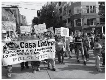 Gilda, una migrante que en el pasado fue indocumentada y ahora hace parte del equipo de Casa Latina, puede ser la personificación de las metas y aspiraciones de muchos de los jornaleros y trabajadores domésticos (indocumentados) en Seattle. Gilda tiene una sonrisa generosa y ojos brillantes y luminosos. Con una voz pausada nos cuenta sobre su viaje migratorio y su trabajo al servicio de otros migrantes en Seattle y alrededor de EE.UU. Es una persona que trabaja por los derechos de los migrantes y nos comparte varias imágenes de marchas, protestas y demostraciones.