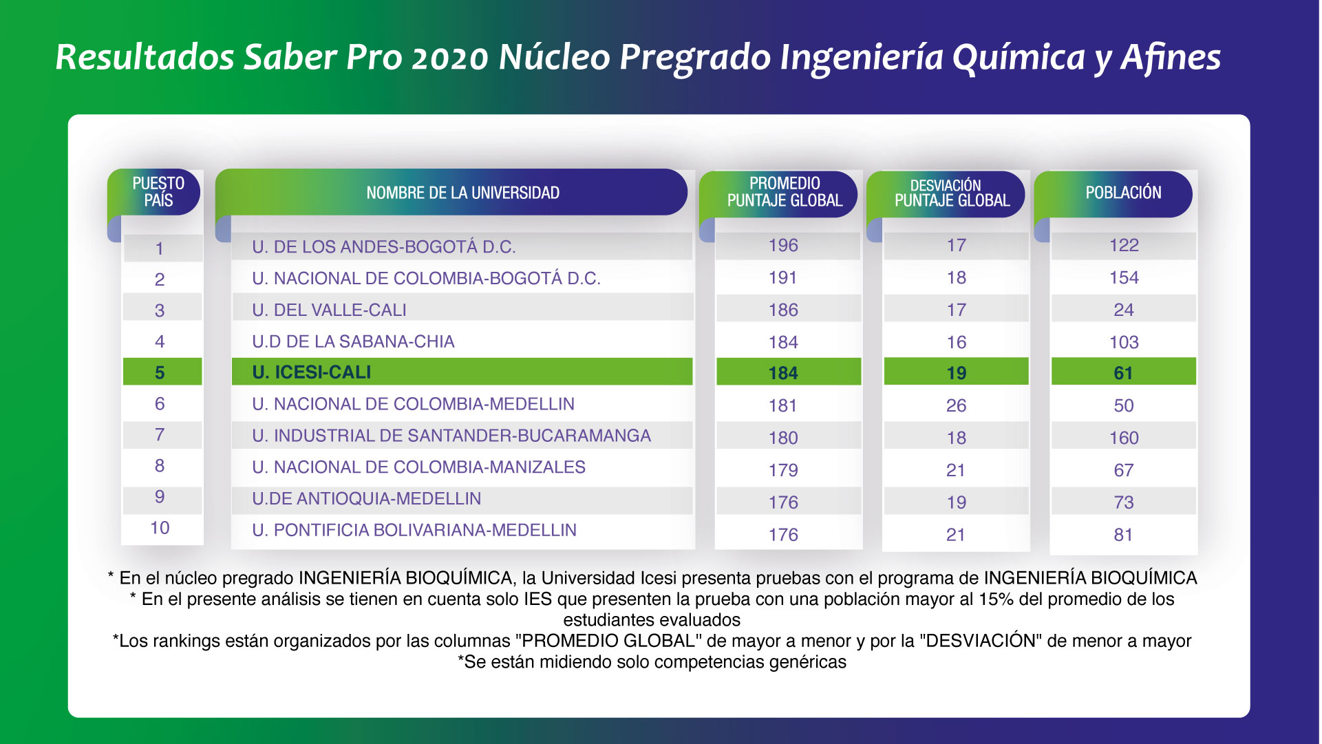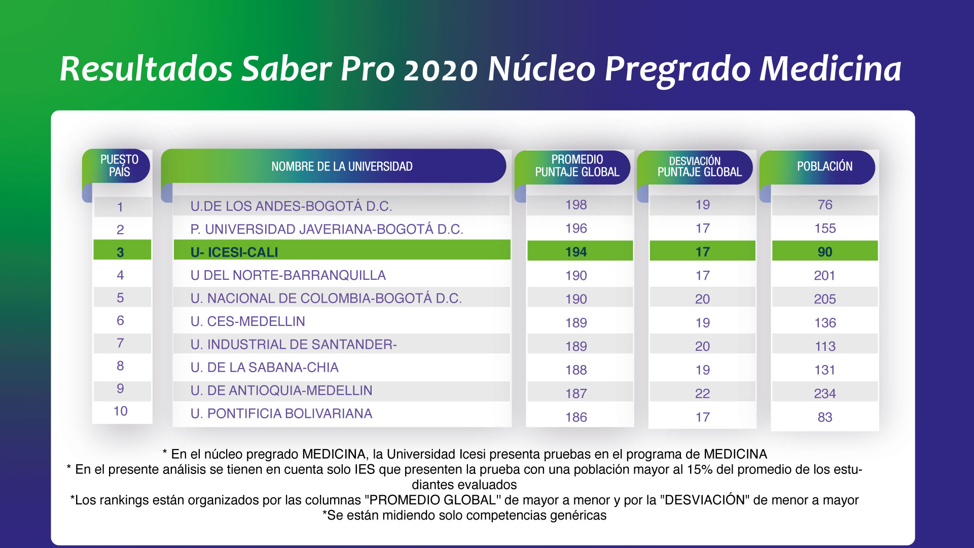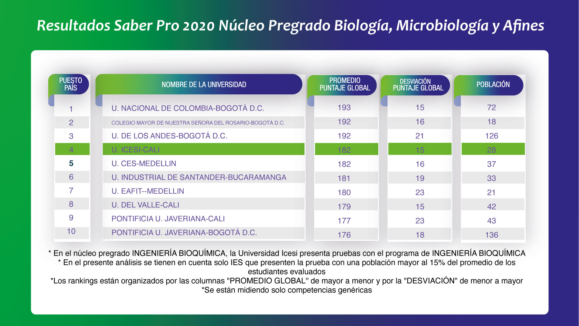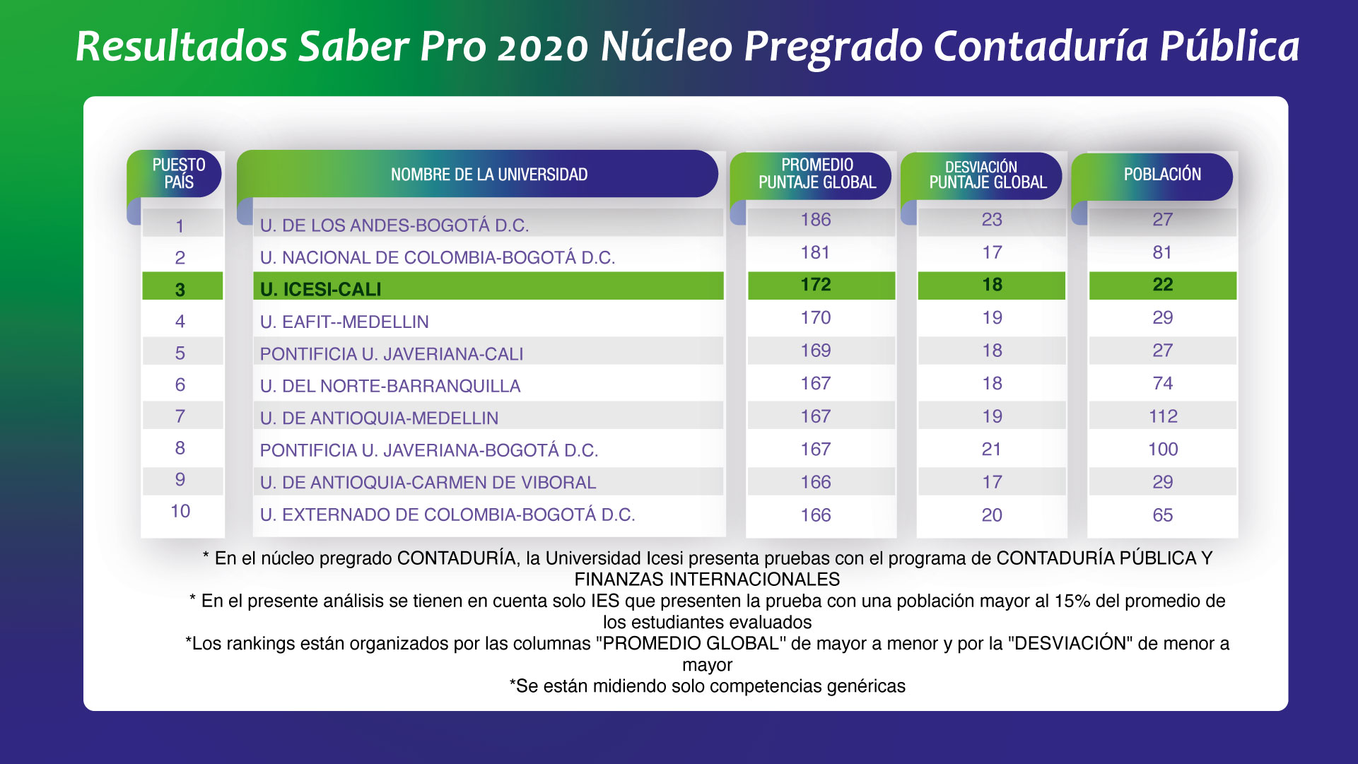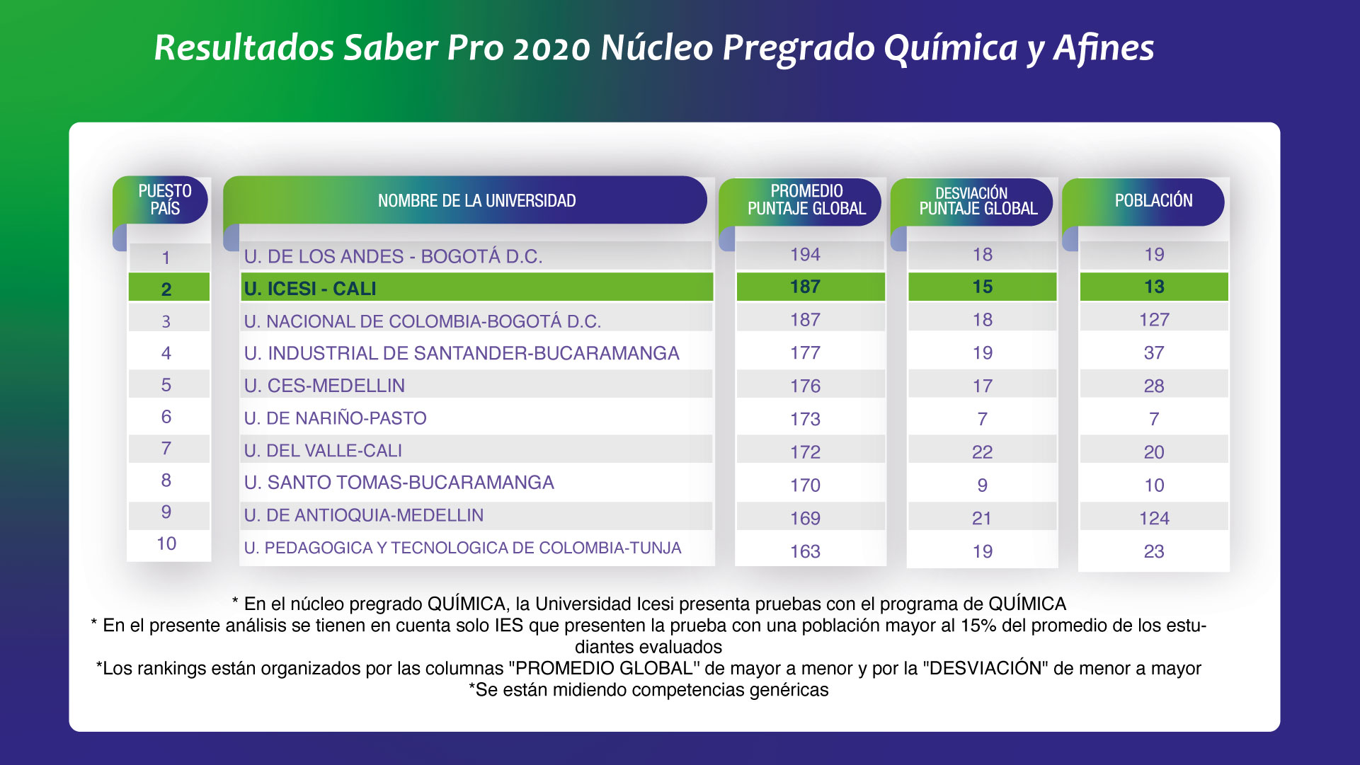 - Población se refiere al número de estudiantes que realizaron la prueba.