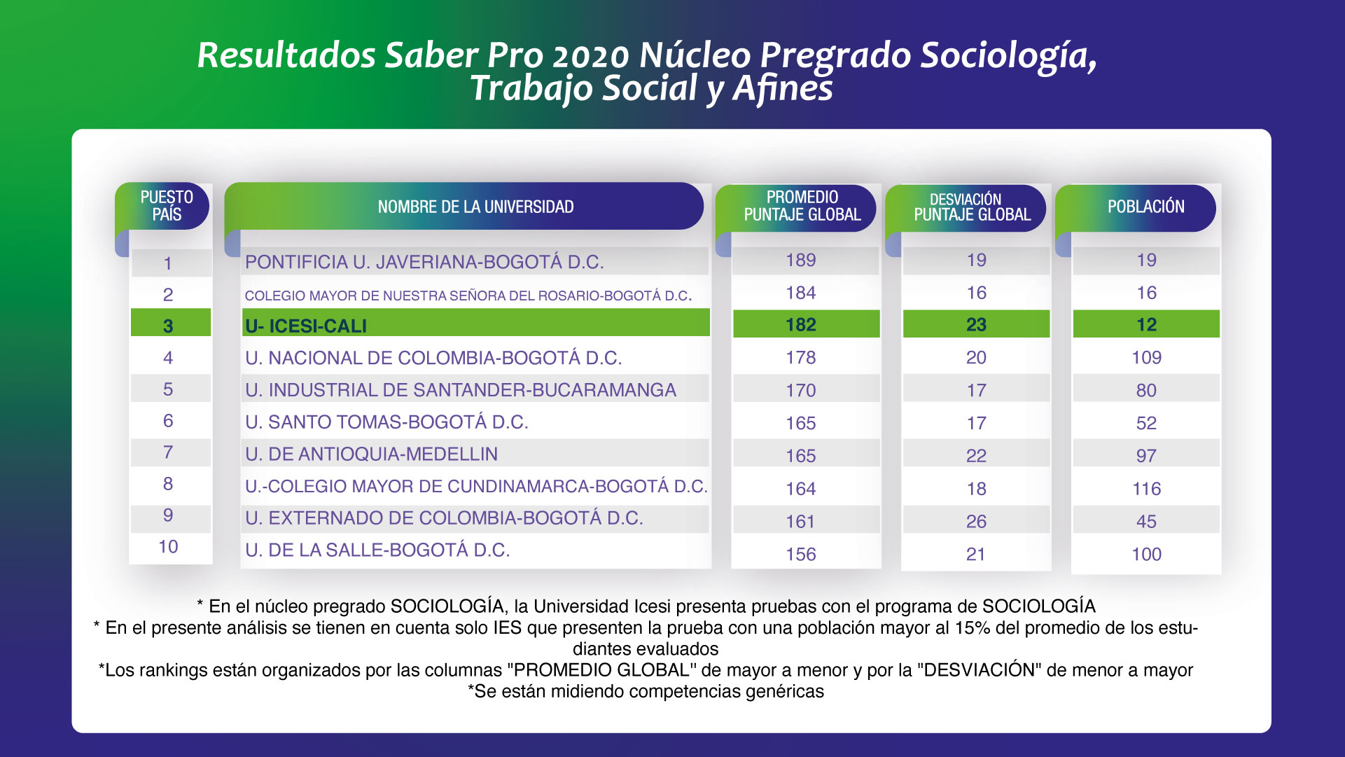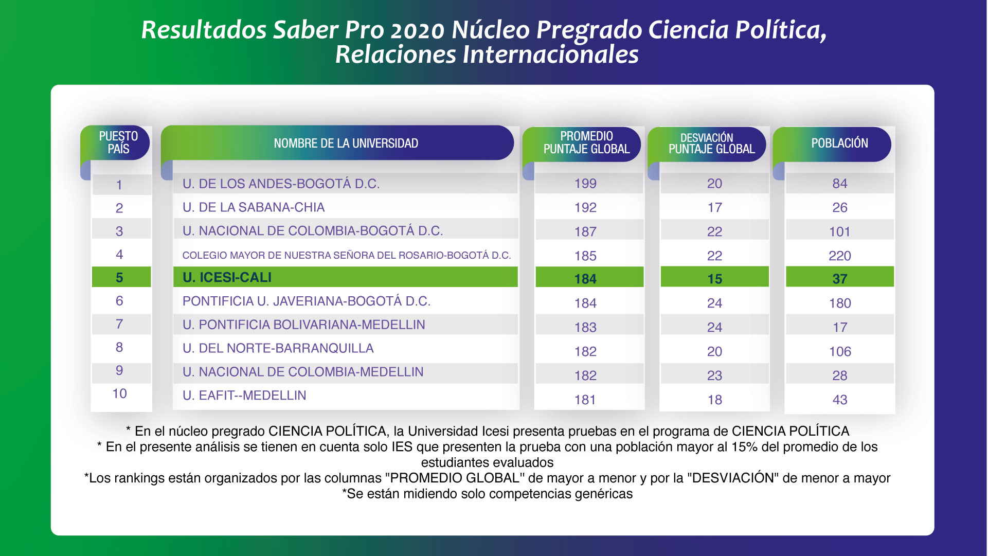 Criterios rankings núcleos básicos de conocimiento- Los rankings están organizados por las columnas "Promedio Puntaje Global” de mayor a menor y por la "Desviación Puntaje Global" de menor a mayor.