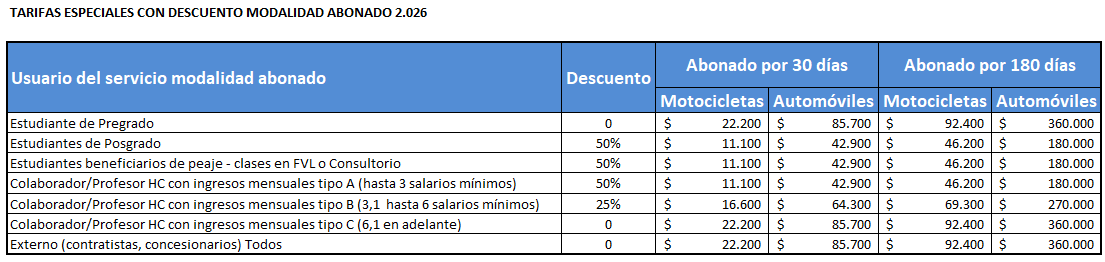 El cobro del servicio de estacionamiento en el campus de la Universidad tiene el propósito de agilizar los tiempos de entrada y salida del estacionamiento y de ofrecer precios especiales a usuarios permanentes, la Universidad ofrecerá descuentos según aplique, en las tarifas a quienes adquieran tarjetas de lectura por aproximación para abonados, válidas para 30 y 180 días calendario. Al abonarse al servicio, se tendrá derecho a inscribir hasta cinco vehículos, pero solo uno de esos vehículos podrá estar amparado por la tarjeta en el estacionamiento de la Universidad en el momento de uso.